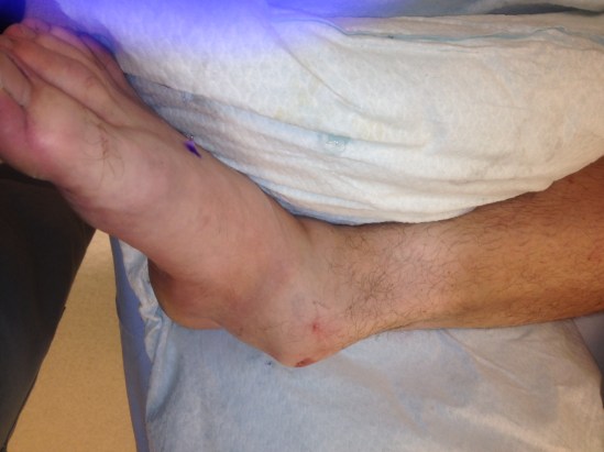 We often talk of Drag Racing being a dangerous sport, all the while not really thinking that anything bad is going to happen to us.  Well, guess what?  Friday was NOT Stan’s lucky day.  In a very unfortunate Starting Line incident, as Stan and the other Crew were attempting to Start Dave’s Funny Car, with Dave strapped in the Car, ready to make his first Qualifying Pass, an accident occurred where, once the “Mag Wire” was pulled, which would allow the Motor to come to life, the Motor revved way up, causing the Car to lurch forward.  Each of the Crew was affected in this incident, but sadly, Stan took the worst of it, as his right foot was caught between the Header of the Car and the ground.  This resulted in a pretty bad break in his ankle and leg, requiring surgery.  (See Pic)