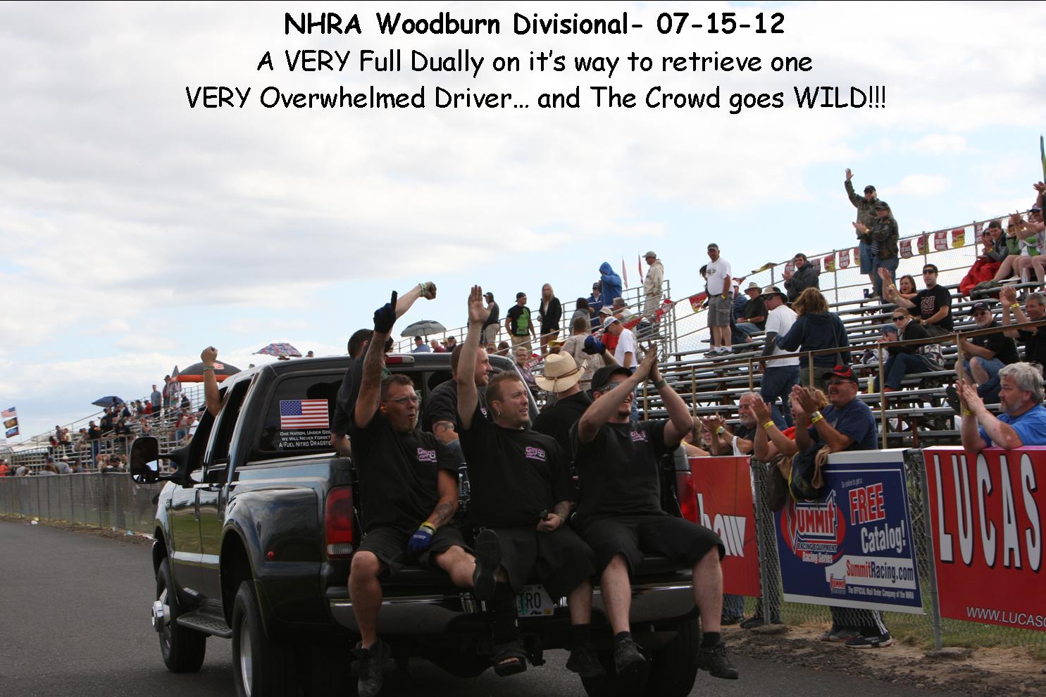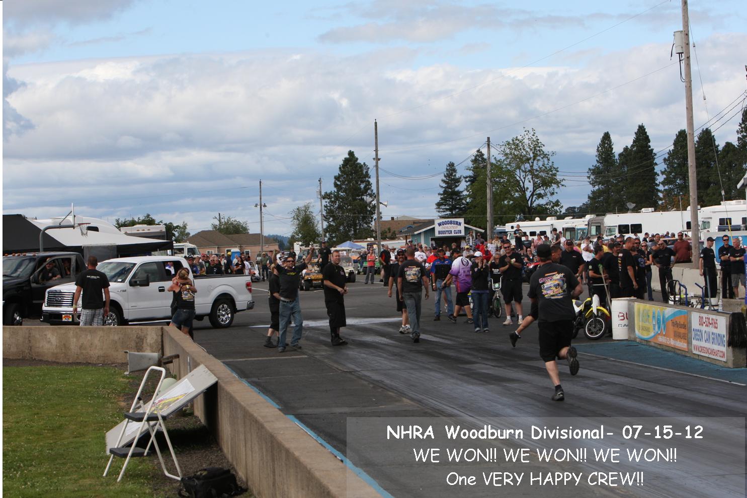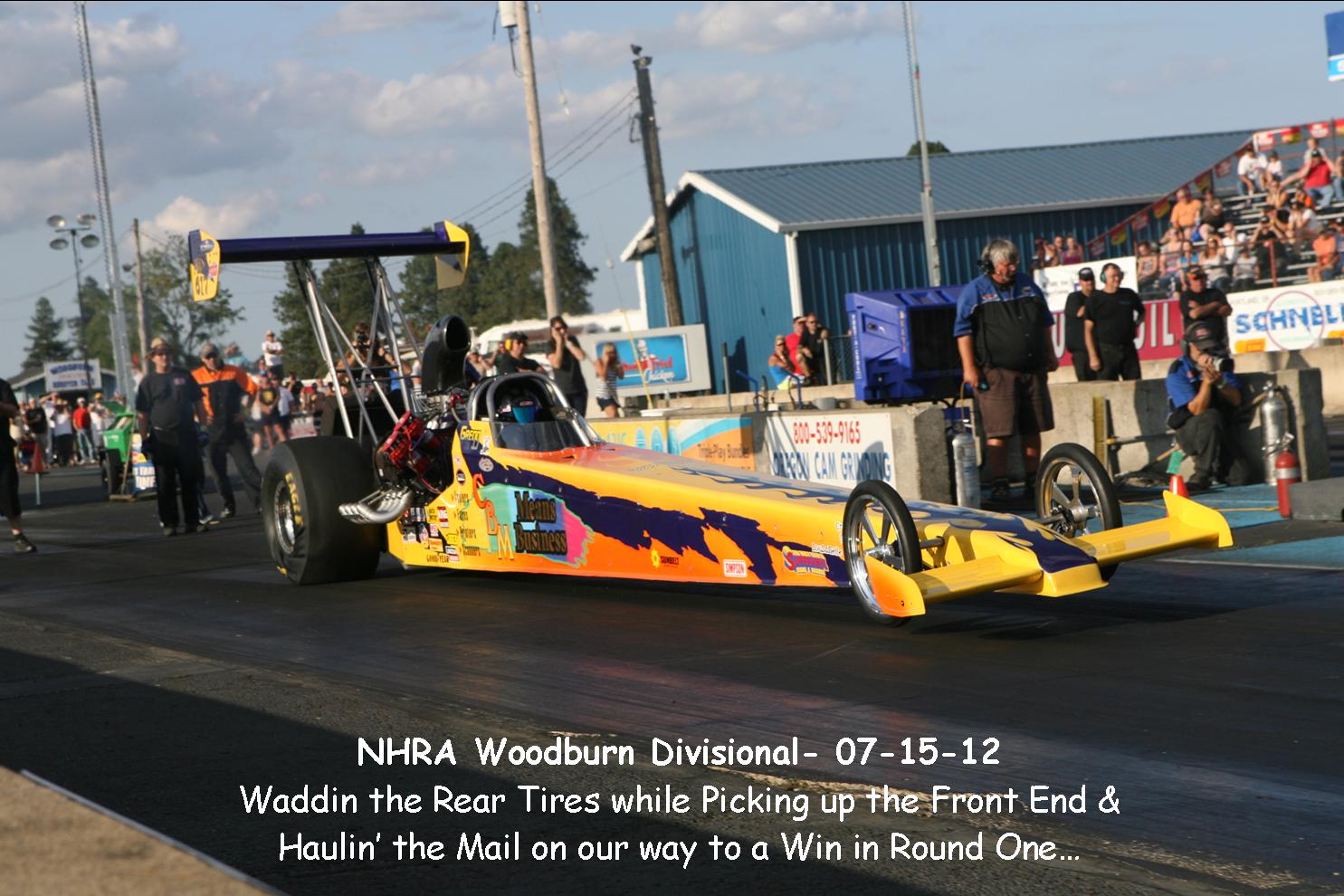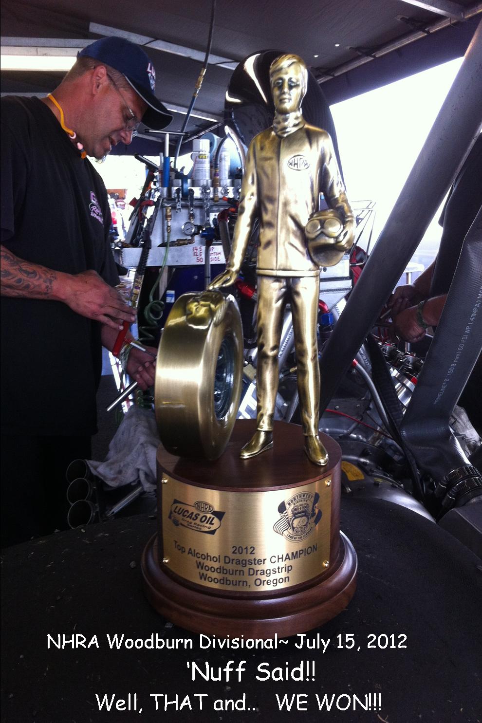 5-2012-07-15-test pass– Our last Divisional Win came way back in 2003. Back then, we were able to run 100% Nitro. We’re now on our 4th Fuel Percentage Drop since then~ Each one intended to slow the Nitro Cars down in an elusive pursuit designed to maintain “Parity” (NHRA’s word, not mine!) between the Naturally Aspirated Nitro Cars and the Supercharged Alcohol burning Cars we compete against. Parity, huh? Rule changes such as this ultimately cause us to spend the money required to regain the Power surrendered to the new Rule, so to ME, in my less than Humble opinion, the only ones who truly WIN with these kinda’ Rule changes are the PARTS Manufacturers, but I digress- Did you Hear???…. We WON!!!