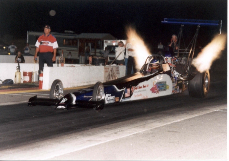 In ’96, I had an opportunity to partner with Russ Parker. I had struck a deal with Dave Henderson to acquire the roller Top Alcohol Dragster that Blaine & Alan Johnson had won the World Championship with in ’89. Russ brought a spare Motor from their Funny Car operation and ‘Viola’! we had a TAD operation!!!! In hindsight, it was pretty pathetic, but, Russ helped guide me to making the needed 6 laps in ONE WEEKEND and I then had my TAD License!! I’d never driven anything much quicker than my Dually prior, although I had made a pass in an 11 second car of an employee once, but I’m not sure that made much difference in terms of my Driving skills at that time. I just know it wasn’t too smart to jump straight into the Blown Alcohol Dragster, but I’ve never been accused of doing things the smart way!! I went 6.19 ET @ 219 MPH to complete my licensing process!! I remember being scared to death along the way that weekend! There are MANY Stories from that weekend!! I’ll share more later….